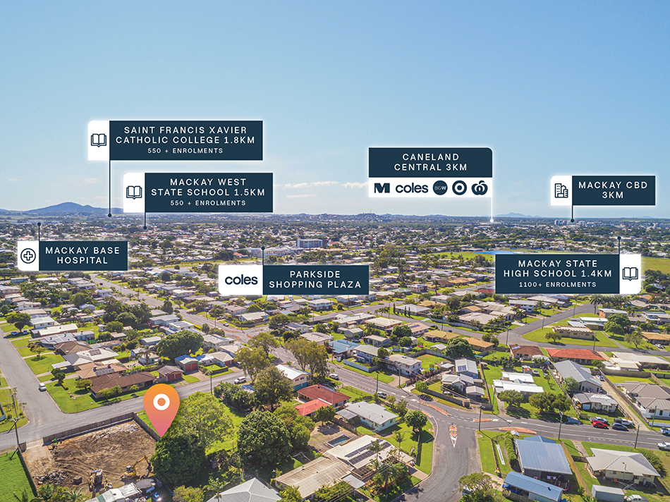 + Conveniently located within close proximity to Mackay’s core amenities, being metres from Mackay Airport and within 3km* of both the Mackay Base Hospital and Mackay CBD
