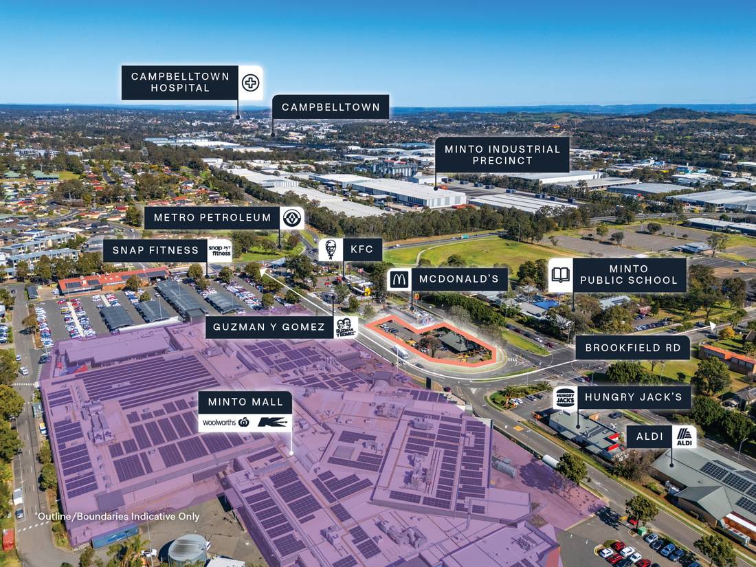 + Prominent gateway position directly opposite Minto Mall, anchored by Kmart & Woolworths with 60+ specialty retailers