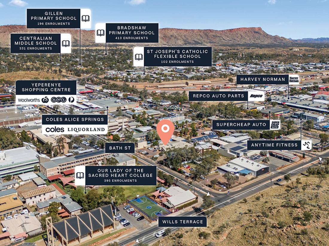 + CBD location with convenient access to Yeperenye Shopping Centre, anchored by Woolworths, BWS, Australia Post and within 1km* of Coles, Harvey Norman, Repco, Supercheap, MyCar and Kmart