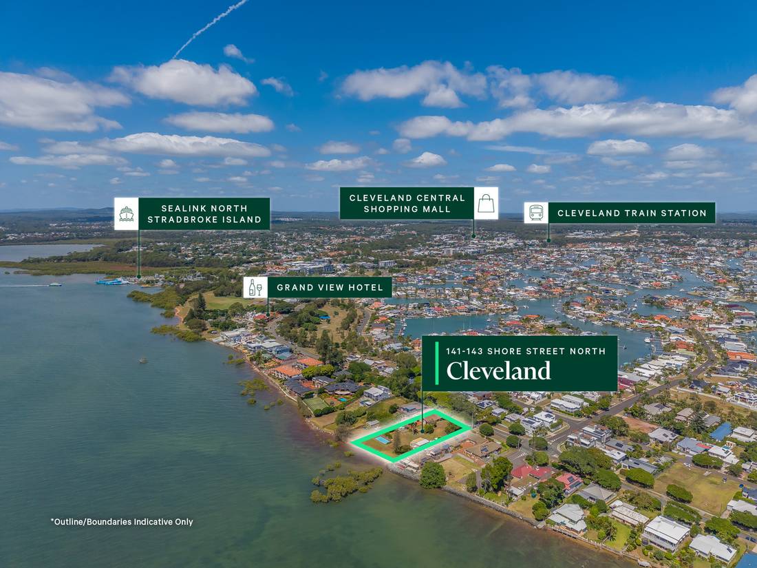 Benefitting from 40m* of frontage overlooking Moreton Bay, the property occupies a prime location on the Cleveland peninsula, one of Redland City’s most desirable coastal suburbs, situated approximately 25km southeast of the Brisbane CBD. As the regional gateway to North Stradbroke Island, Cleveland attracts strong visitation and sustained residential interest, supported by its coastal setting and proximity to key lifestyle, commercial, and retail amenity.