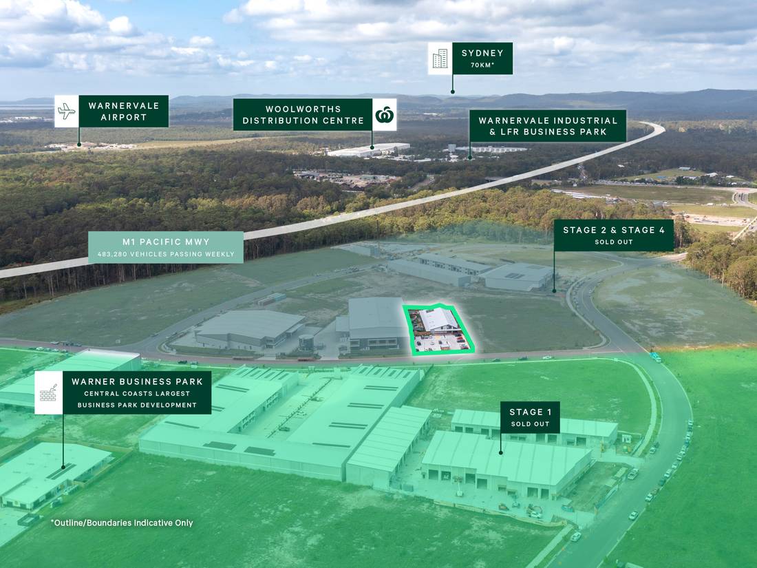 + Strategic location in the brand new Warner Business Park, an 89-hectare master-planned development comprising four stages, now sold out, midway between Sydney and Newcastle with direct M1 Pacific Motorway access, servicing one of NSW’s most significant emerging industrial and population corridors