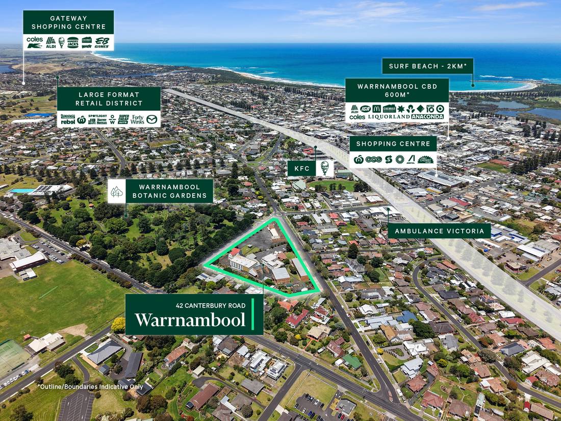 + Conveniently positioned 600m* from Warrnambool CBD which includes major national retailers Coles, Woolworths, ALDI, McDonalds, KFC, Chemist Warehouse, NAB, ANZ, CBA plus many more.