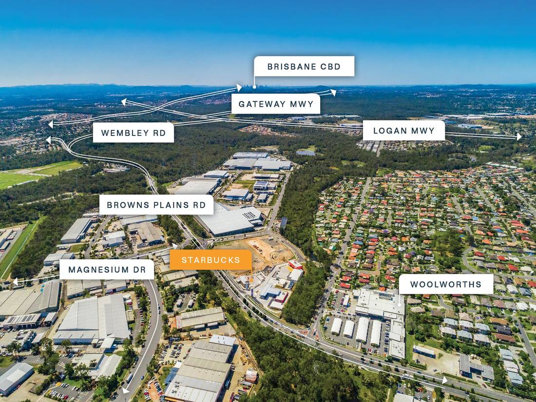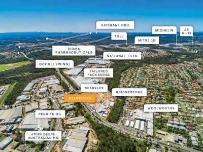 Surrounded by many of Brisbane’s most important logistics facilities (Charter Hall, GPT, Frasers, Toll, Google, DHL, Metcash, JB Hi-Fi, Sigma Pharmaceuticals, Michelin, John Deere, Mitre 10, Lion Drinks and Dairy, Rinnai and Penrite Oil) and a Woolworths shopping centre.